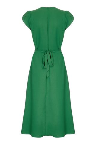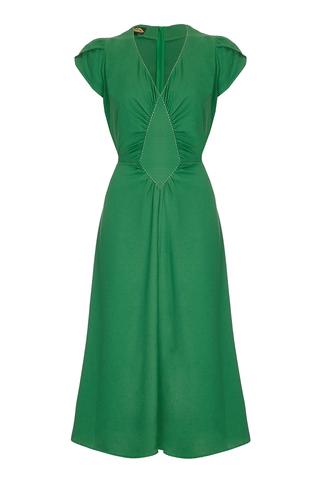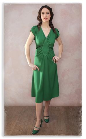 Classic 1940s day dress in a gorgeous Montecarlo green moss crepe. The Anya dress features a v-neckline edged with contrast stitching and a lengthening diamond waist panel cut to flatter.