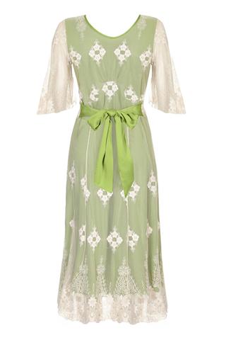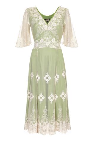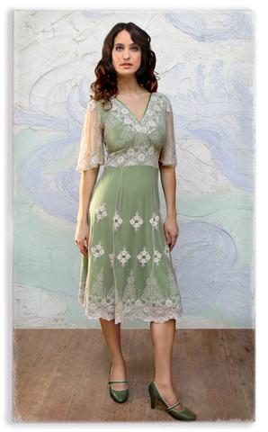The popular Thirties style Cathleen dress comes in this delicious new colour confection of ivory lace with a beautiful green underskirt and green silk trim. With flattering v-neck, panelled skirt, scalloped lace-edged hem and pretty sheer lace sleeves.